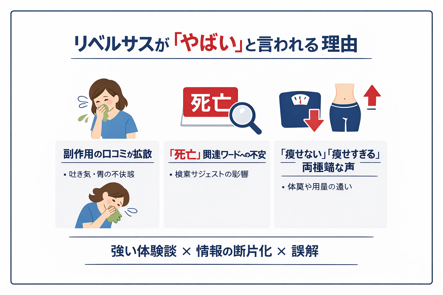 では、なぜ「リベルサス」と「死亡」という言葉が結びついているのでしょうか。背景として考えられるのは、次のような要因です。