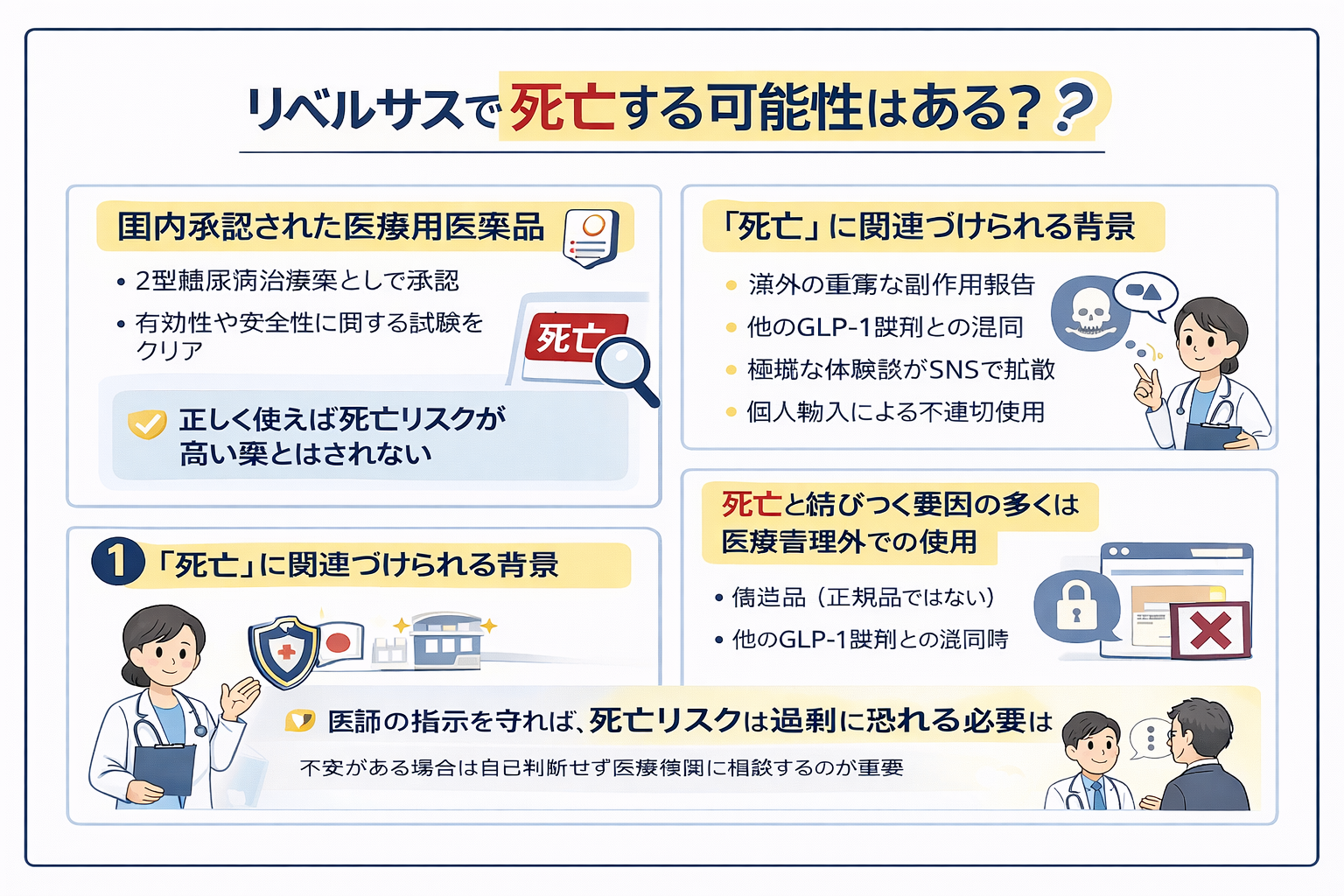 インターネット上では、「リベルサス」と「死亡」という言葉が並んで表示されることがあります。これだけを見ると、不安を感じるのは当然です。