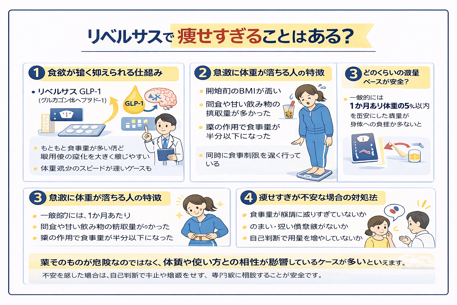 リベルサスは「自然に食欲を抑える」薬ですが、極端な食事制限と組み合わせると体調を崩しやすくなります。薬だけに原因があるとは限りません。