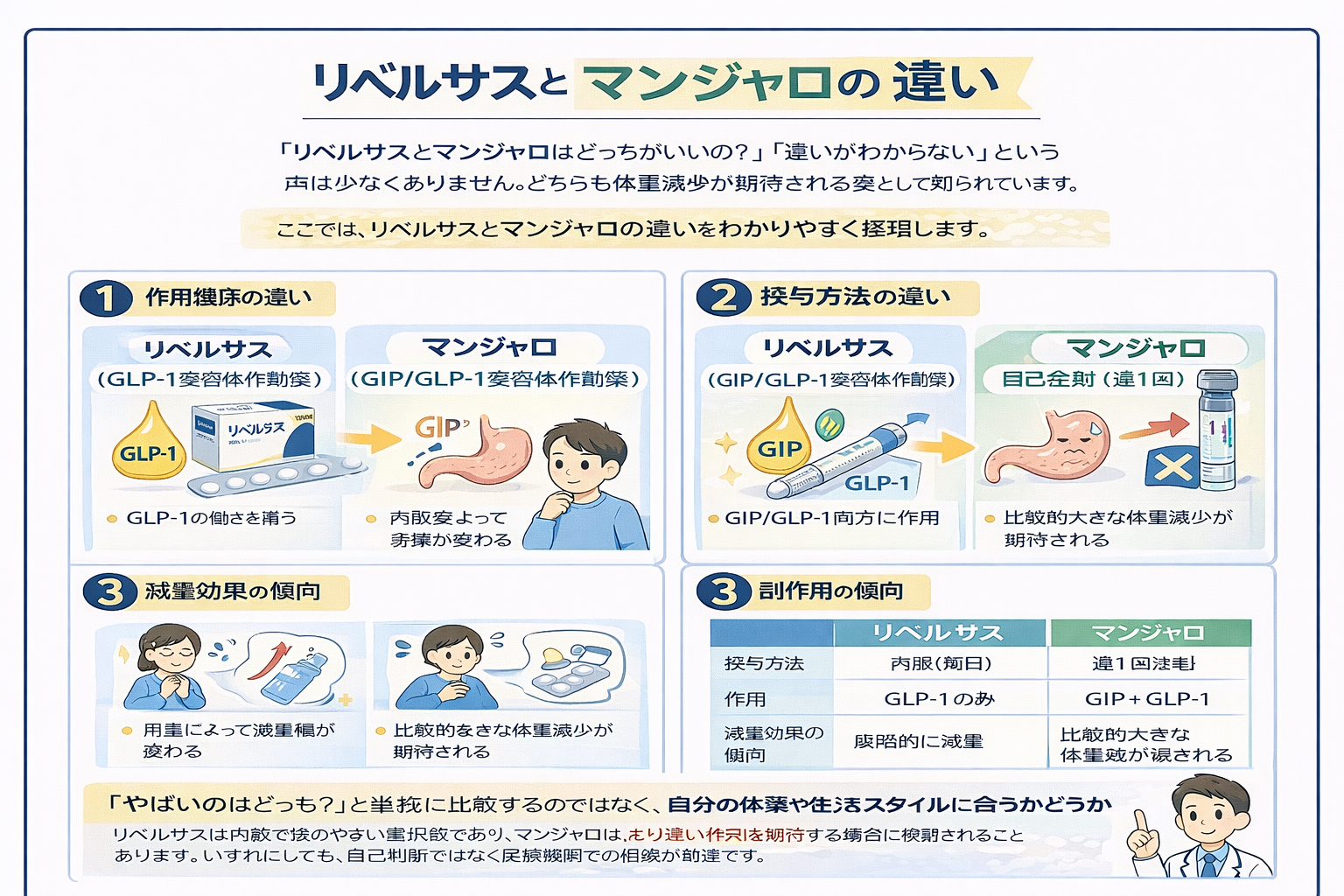 ここでは、リベルサスとマンジャロの違いをわかりやすく整理します。