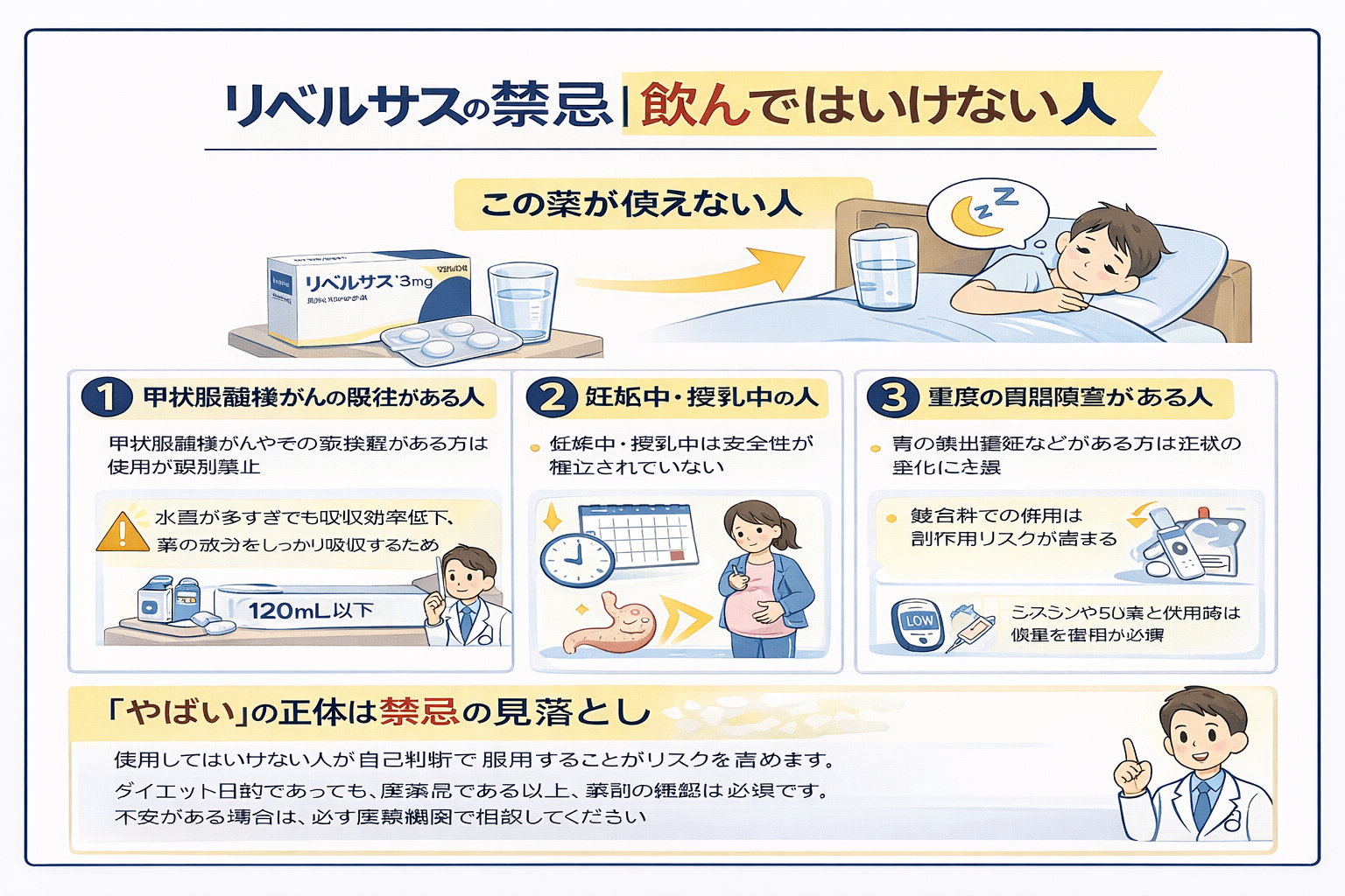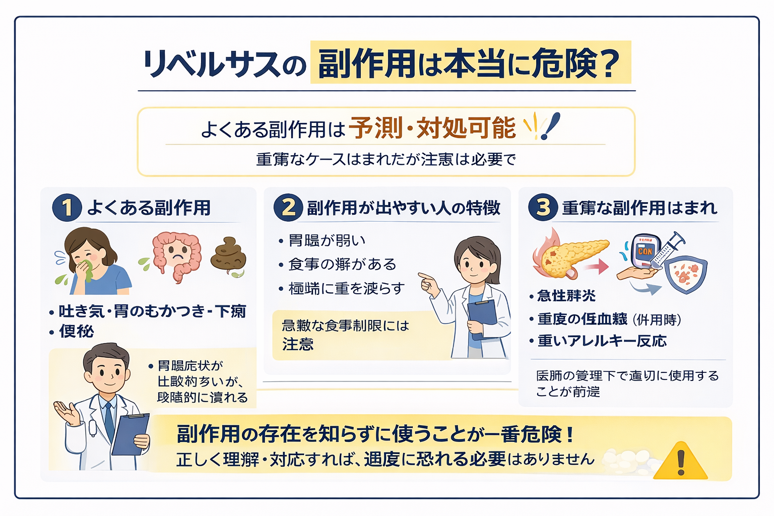 リベルサス自体が特別に危険な薬というよりも、禁忌に該当する人が使用したり、自己判断で用量を変更したりすることがリスクを高めます。
