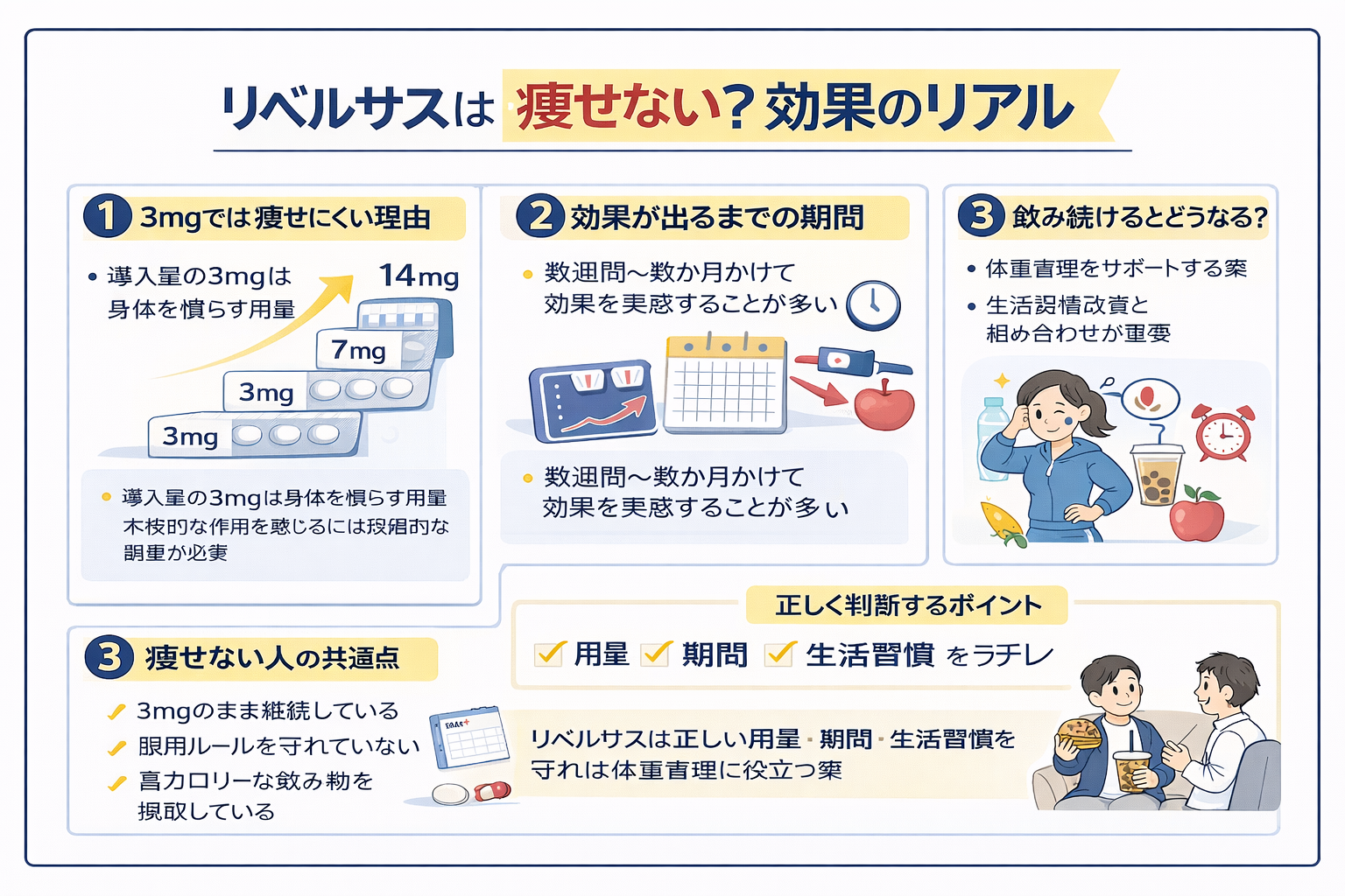 リベルサスの3mgは導入量であり、必ずしも減量効果を目的とした量ではありません。この点を知らないまま服用すると、「効果がない」と感じやすくなります。